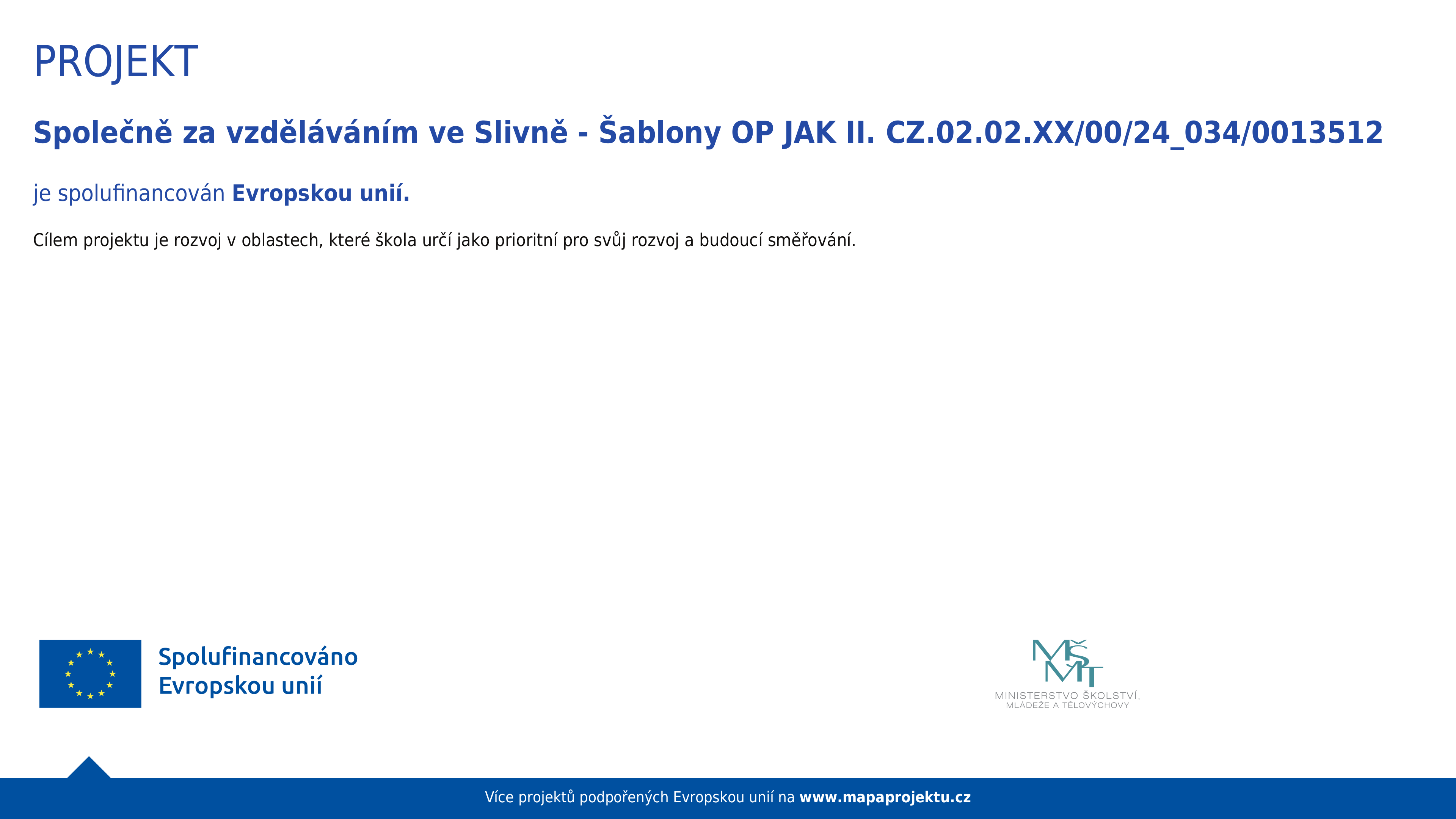 Naše škola Základní škola a mateřská škola Dolní Slivno realizuje projekt Společně za vzděláním II., reg. č. projektu CZ.02.3.X/0.0/0.0/20_080/0022047, podpořený z výzvy MŠMT Šablony III.